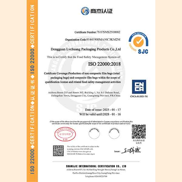 对于正邦包装这样的食品级包装袋工厂而言,获得ISO 22000认证意味着我们建立了一套科学、预防性且可追溯的体系,能够持续稳定地生产出安全、合规的食品接触包装材料。